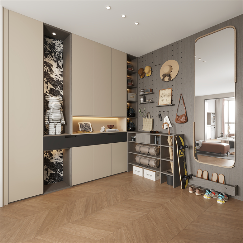 推開家門,迎面而來的是精心設(shè)計(jì)的玄關(guān)空間。這里不僅是收納功能區(qū)域,更是從喧囂都市回歸寧?kù)o生活的過渡地帶。趣逸系列玄關(guān)以穿插式設(shè)計(jì)手法打造立體視覺層次,創(chuàng)意洞洞板讓收納兼具功能性與藝術(shù)感。