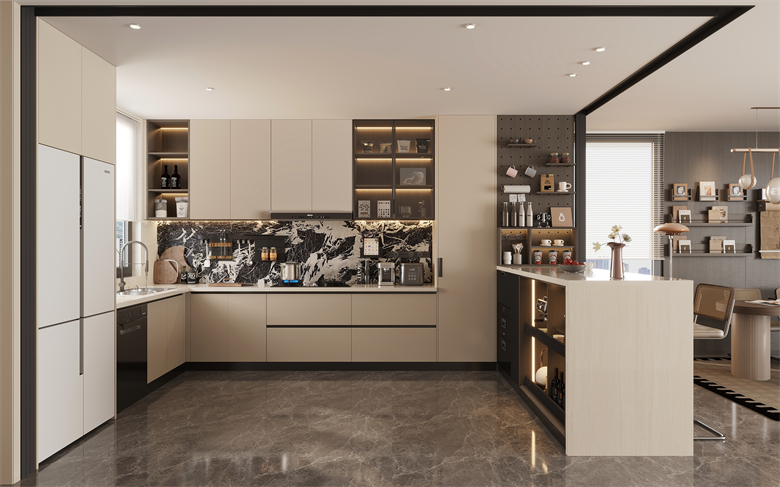 開放式餐廚設(shè)計(jì)是趣逸系列的亮點(diǎn)之一。小吧臺(tái)的巧妙設(shè)置既可作為早餐角,也能變身為深夜小酌的浪漫空間。彌月UV膚感櫥柜門板防指紋易清潔,內(nèi)嵌式家電讓操作動(dòng)線流暢合理。這里既有現(xiàn)代廚房的利落,又保留著家的溫度。