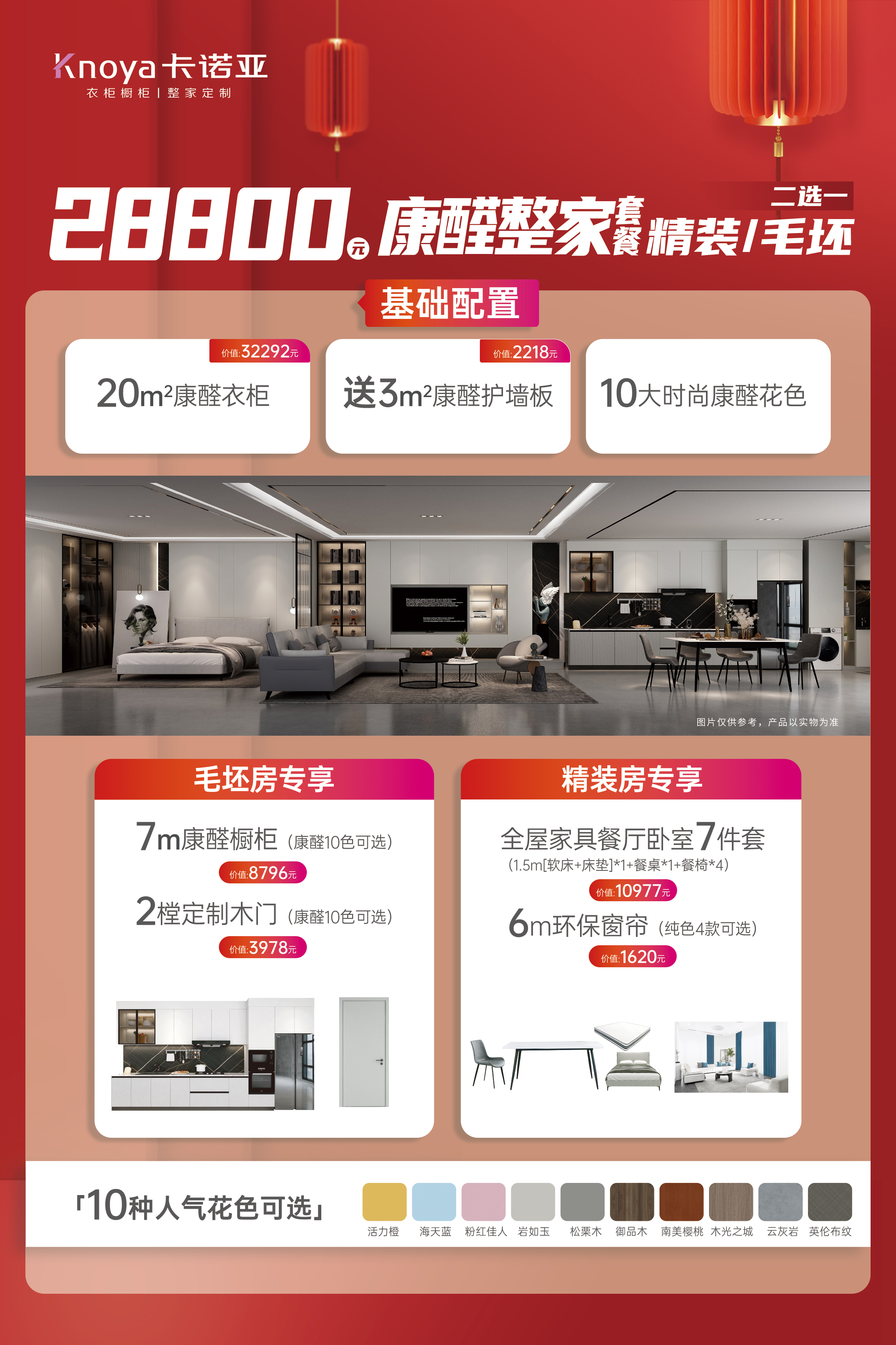 28800元康醛整家套餐=20㎡康醛定制柜+7m康醛櫥柜+2樘定制木門(mén)(毛坯房)或20㎡康醛定制柜+餐廳臥室7件套+6m窗簾(精裝房),再送3㎡背景墻,全屋標(biāo)配康醛板,花色再次升級(jí)為10大人氣花色,一個(gè)套餐就能將柜、墻、門(mén)等產(chǎn)品一站配齊,真正實(shí)現(xiàn)“一家搞定,拎包入住,省錢(qián)省心”。